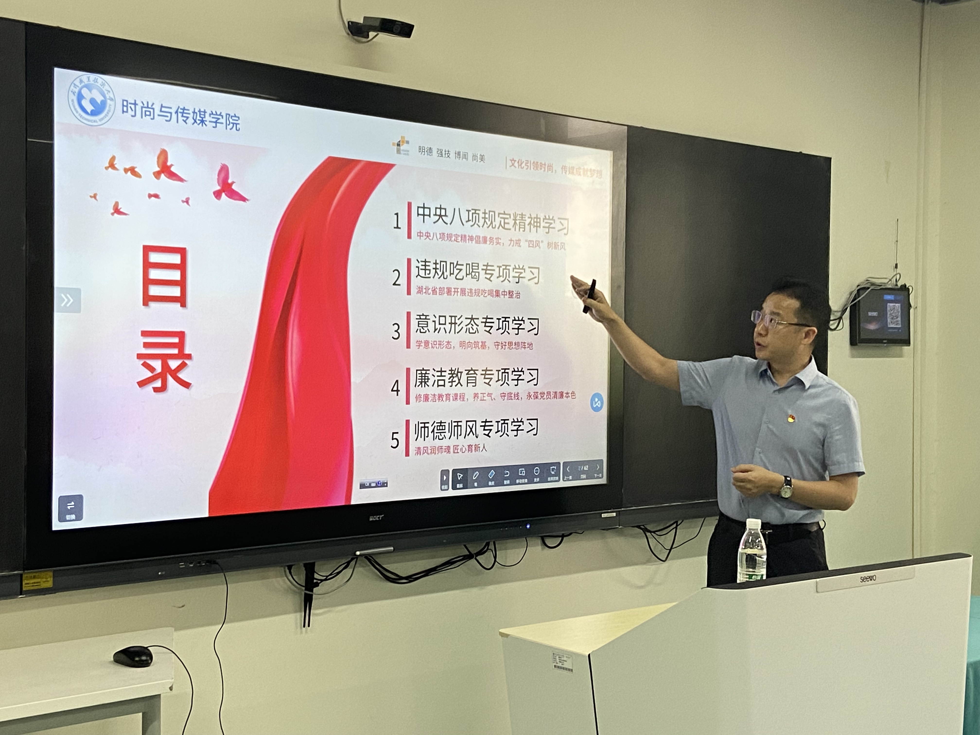 随后,公司党委书记曹晓斌以“作风攻坚,实干书写时代答卷”为主题讲授专题党课。党课紧密围绕中央八项规定精神学习核心,系统深入地讲解了违规吃喝专项整治的纪律要求、意识形态阵地坚守的责任担当、廉洁自律的底线意识以及师德师风建设的职业准则,并在讲解中穿插知识问答环节,与会党员教师积极响应,踊跃参与,现场学习氛围浓厚,有效提升了学习实效。
